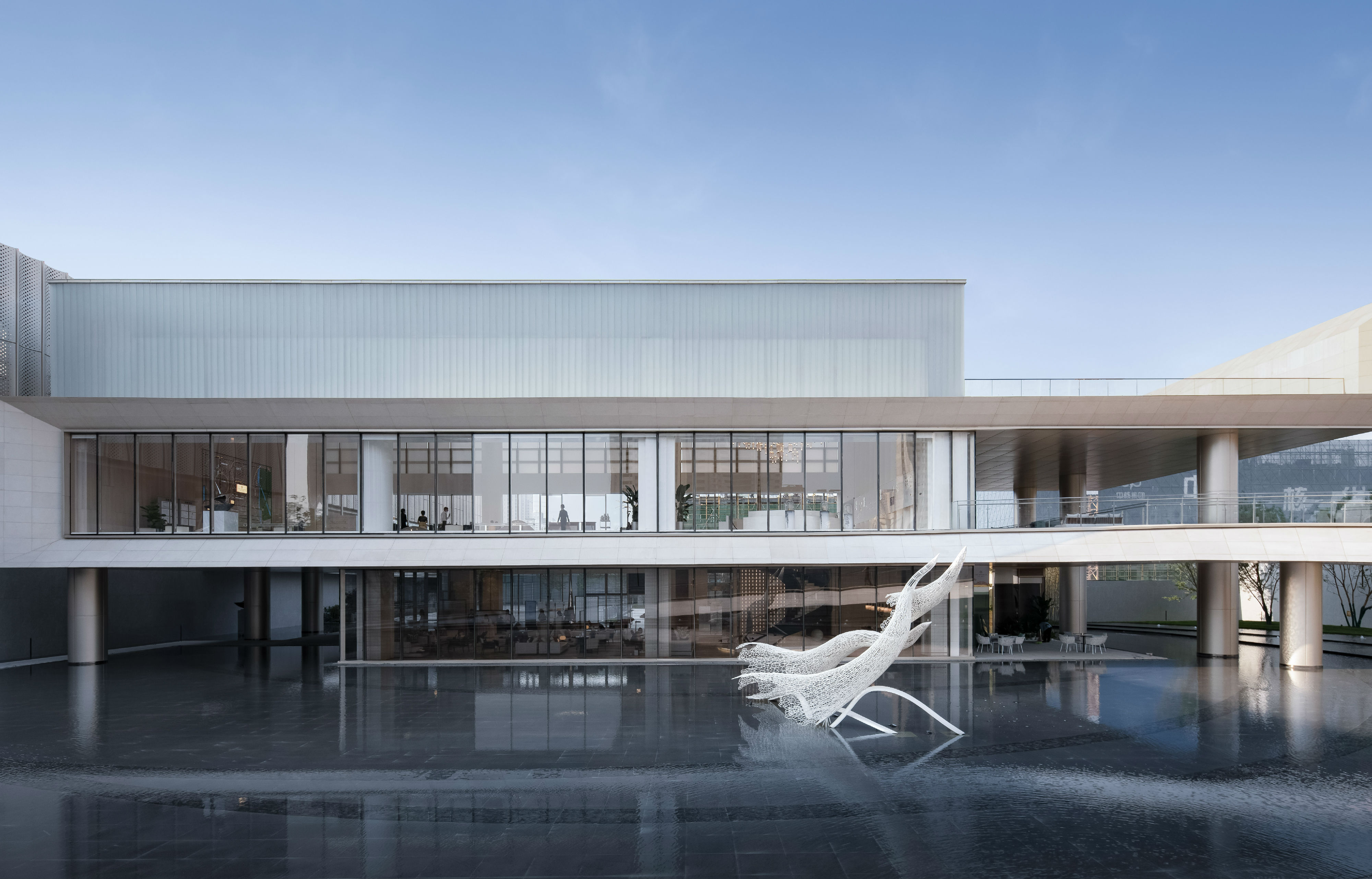 在相对围合的空间中建筑天然占据主位,近观建筑和四周近7M的墙体会带来视觉的压迫感,选择用水来做基底,联通架空及各处通透空间,远端水跌落至下沉院落,近处的水面有了完整的作画空间。