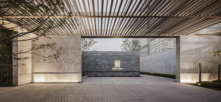 后场参观动线以曲折的人行路径,将游览步道与森居生活理念有机渗透,通过简约的片墙、草阶、纯粹的铺装、密植的绿篱来衔接社区与城市的关系。三级大台阶和片墙围合成静谧的通过性空间,隔离了城市的喧闹。