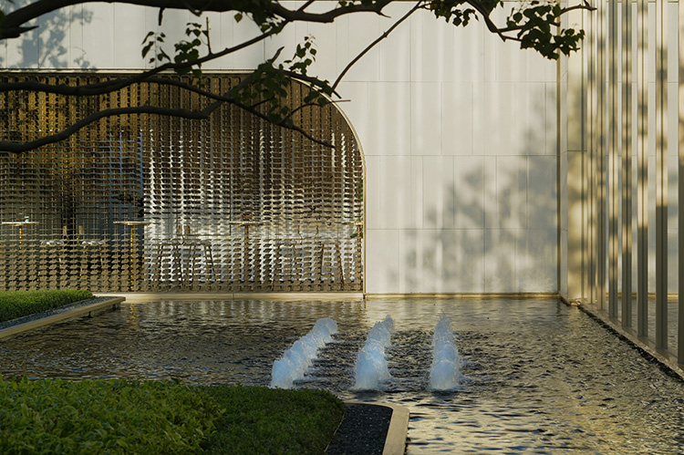 在处理前场与市政的衔接中,考虑到既不能和城市空间相互影响,又能有足够的吸引力,夺得眼球;设计师决定运用礼仪式的入口呈现,设计中利用轴对称的入口门厅,完美比例的立面,彰显入口的平衡与稳定,消耗了由于地势不平整的先天劣势;入口的左右高差利用精致收边的花台消耗两边不同的高差,从正立面观看,毫不影响它的精致美感。入口正中央的水景提取了建筑语言对水景形状进行同化处理;水景的比例,通过多次的模型推敲,最后呈现出的完美比例。门厅两边层级造型结合导入式的布局,给空间边界增加延伸感,并且引人入胜。