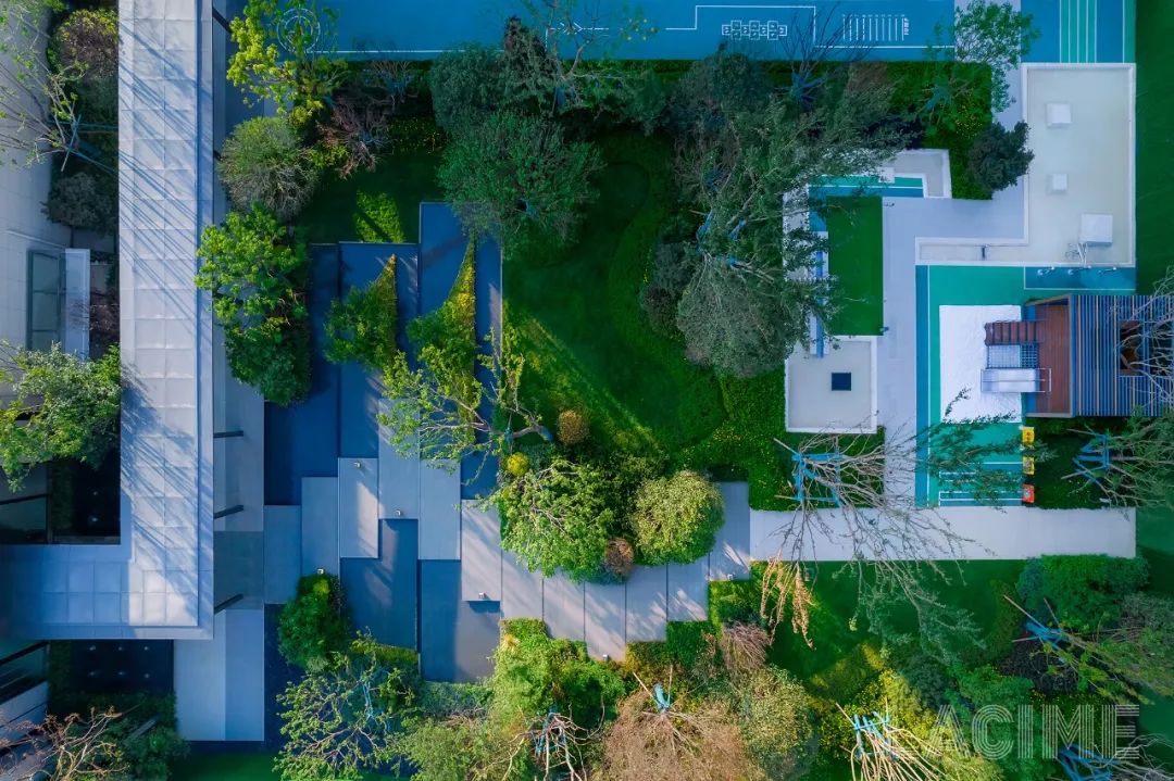 进入主入口门庭,风声簌簌,车马喧嚣隔绝于外,即是入境避世。地块内部以入口向内延伸,结合西侧主入口打造自然生态的东西体验轴线,南北向结合归家大堂构造品质感的礼遇轴线。原始场地为高差850mm斜坡,空间较大,视线过于开阔。
