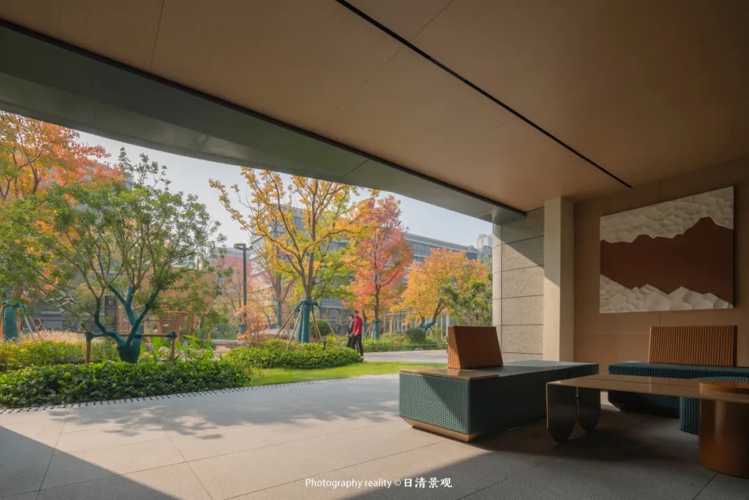 也有林下可以撩拨嬉戏的硬质叠泉,清透的会客廊架,